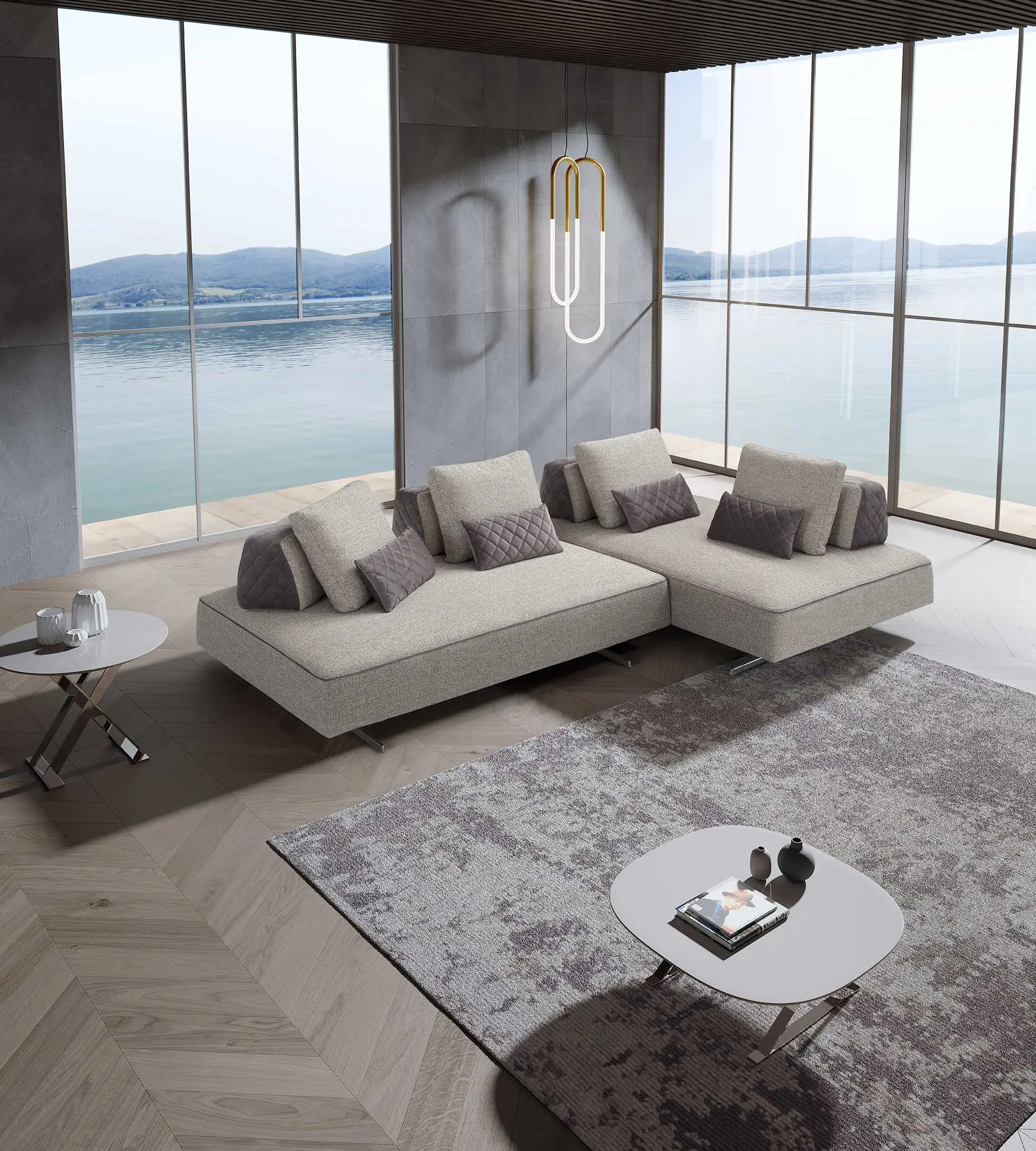 Il rivestimento in tessuto effetto canapone sorprende per la piacevole morbidezza al tatto e per la perfetta aderenza antiscivolo. Consente un sistema frenante tra la superficie della seduta e i cuscini schienale: semplicemente adagiati sulla base, questi ultimi permettono di personalizzare il comfort assumendo tutte le declinazioni desiderate.