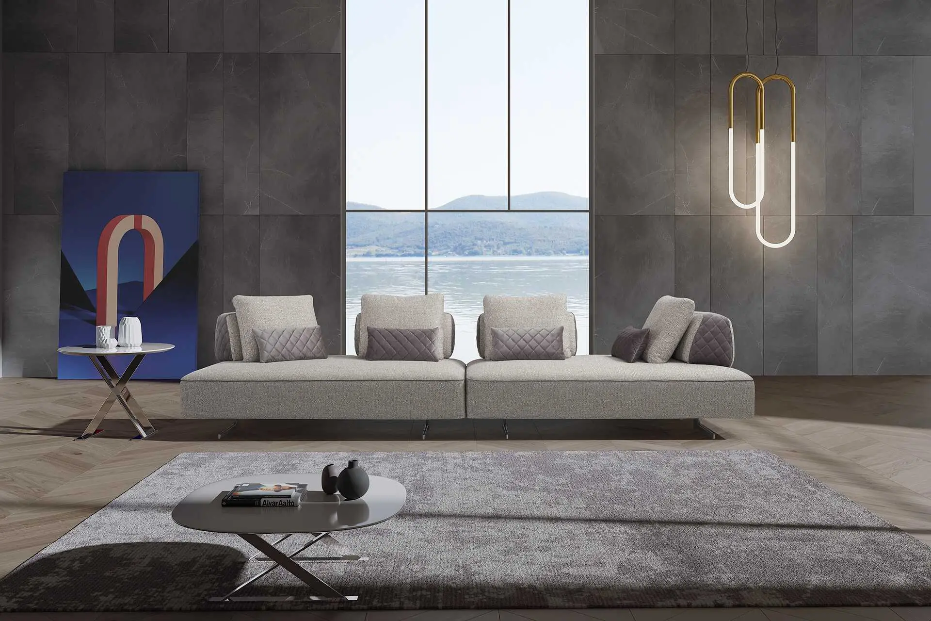 Due moduli fluttuanti su un basamento di alluminio e la particolarità dei cuscini schienale, isolati e distanti tra loro, compongono l’essenza del design di Gea. Il dettaglio della cucitura che corre lungo il bordo della seduta ne esalta la qualità sartoriale mentre il piede a vista in metallo lucido conferisce all’estetica una forte originalità.