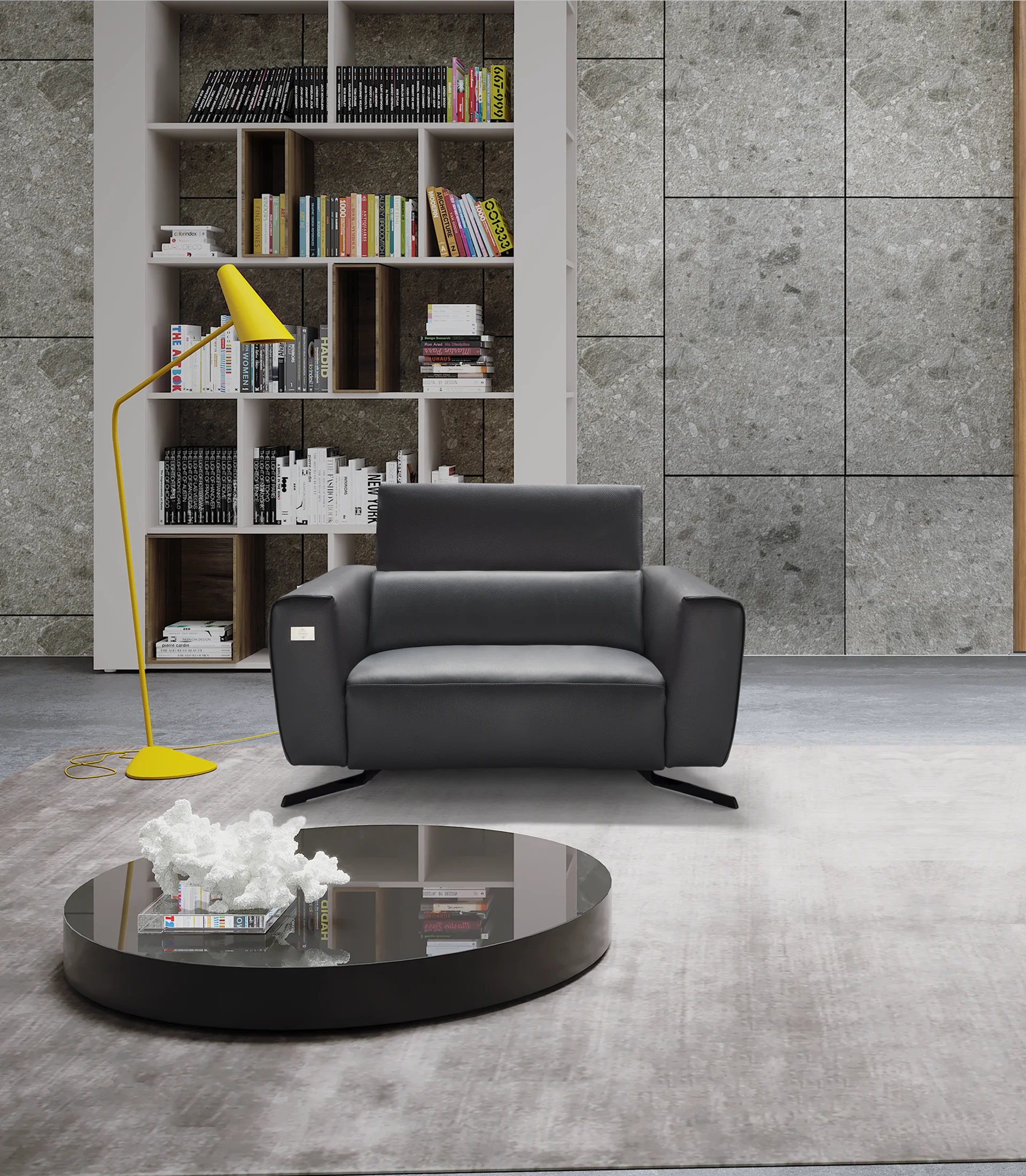 Il rivestimento è in pelle bovina europea, disponibile in 18 tonalità: dai colori neutri e classici come il nero e il grigio fumé, fino alle nuance più vivaci e di tendenza.